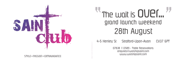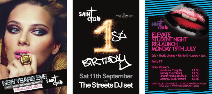Saint Club Night Club Stratford-Upon-Avon, UK Logo, Branding, Flyers, Posters, Banners, Signage, Photography